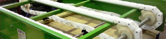 Конвейеры с ящичной цепью предназначены для перемещения в горизонтальной и наклонной плоскости по складу или производственному участку пластиковых ящиков, гофрокоробов и другой продукции. Широко применяются в мясной и молочной промышленности.
